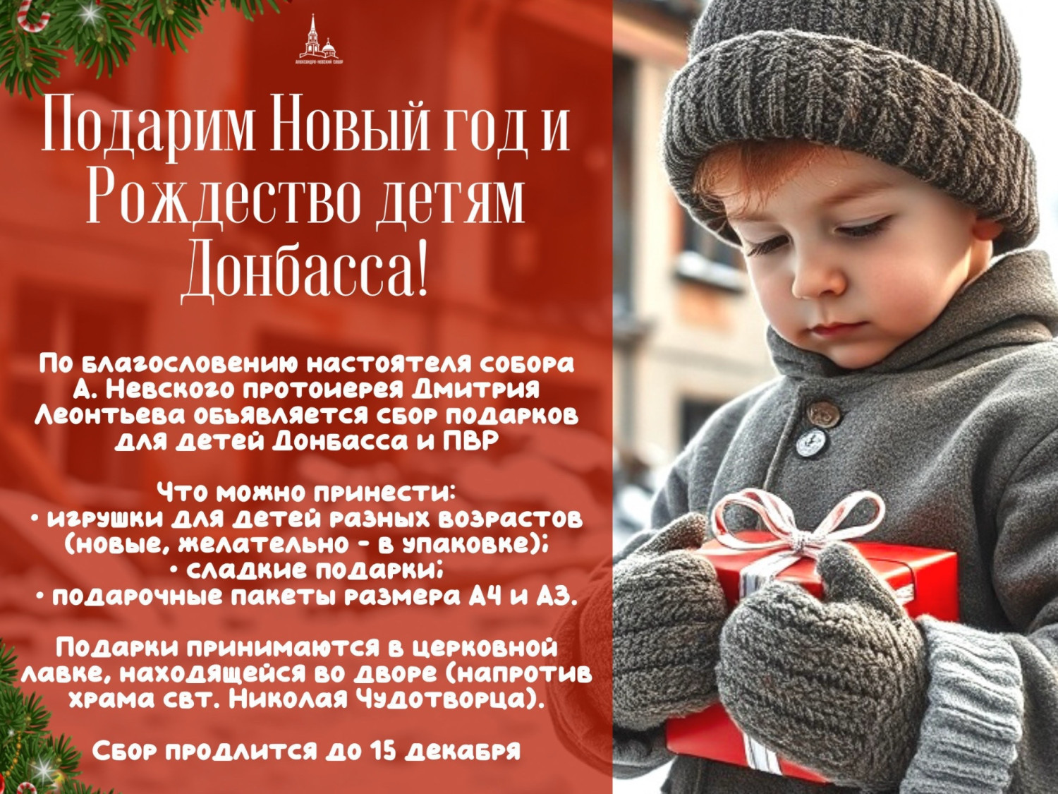 По благословению настоятеля собора Александра Невского г. Ижевска объявляется сбор подарков для детей Донбасса и ПВР (пунктов временного размещения) к Новому году и Рождеству Христову.